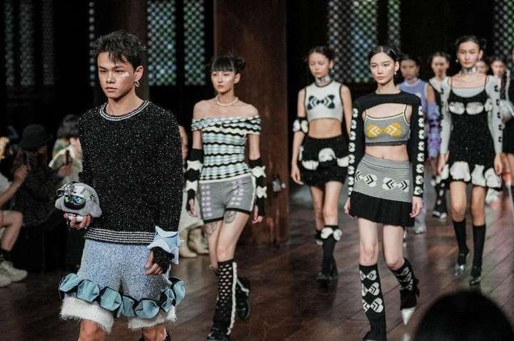 AQUA LIXUN SU 本季灵感来源于《阿基拉》《攻壳机动队》等经典日本动漫,用“软质盔甲”重塑针织的结构美学。但当ropet一出现,整个秀场为科技未来感的概念注入了一丝温柔和灵气,仿佛未来世界的宠物信使突然穿越到了江南古镇。